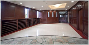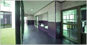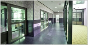 ガラス張りの中庭に接する廊下